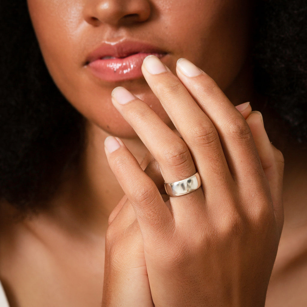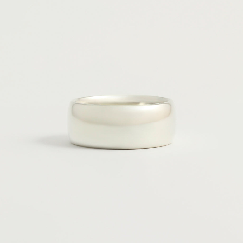 With a rounded outside and lightly curved inside, this ring is super comfy. It's 8mm wide and 1.6mm thick.