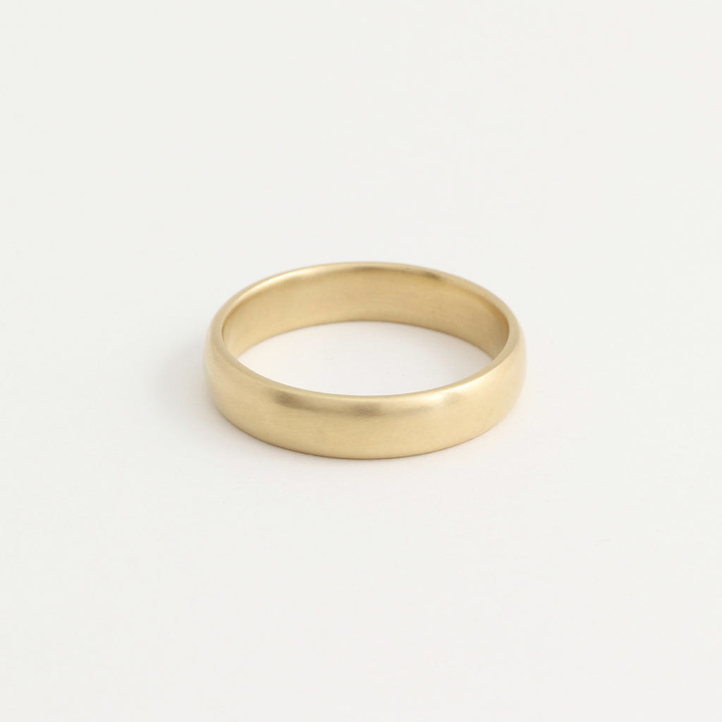 The warm tones of Yellow Gold are a classic finish for a wedding band. This ring is 4mm wide and 1.5mm thick with a rounded outside and lightly curved inside, so it’s super comfy.
